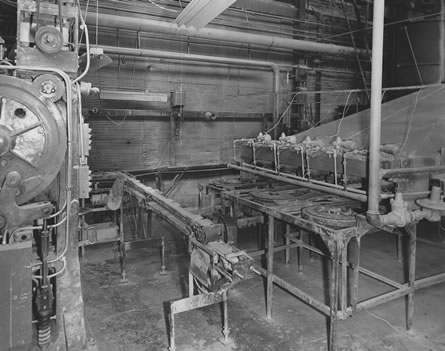![]() 8. Conveyor used to turn tiles over. Note tiles on top belt are upside down (as they come from press). Tiles on lower belt are right side up. |