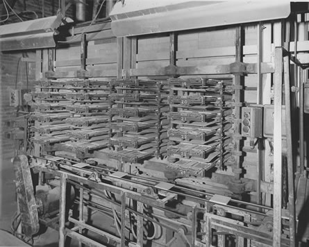 ![]() 11. Glazed tiles emerging from spray machine. Note tiles "spread out" automatically and are rotated 90 degrees. |