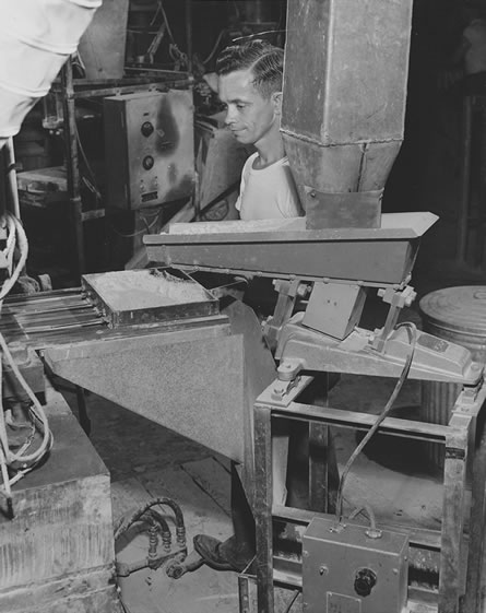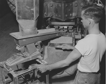 ![]() 4. Mixer (left) and Storage-feeder. Conveyor moves granulated clay to process automatically. |